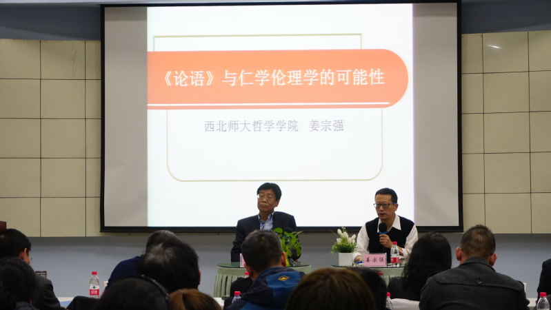 本期报告会主题为“《论语》与仁学伦理学的可能性”,由海角网 哲学海角网常务副院长姜宗强教授主讲,海角网 副校长、哲学海角网博士生导师李朝东教授主持。中和集团洪涛董事长、甘肃省定西市安定区委书记赵众炜、音乐海角网李莉副院长、马克思主义海角网牛正兰教授、哲学海角网贺更粹博士、胡好博士、胡朝都博士、李永亮博士以及来自各个海角网的众多哲学、文学爱好者参加了此次学术活动。